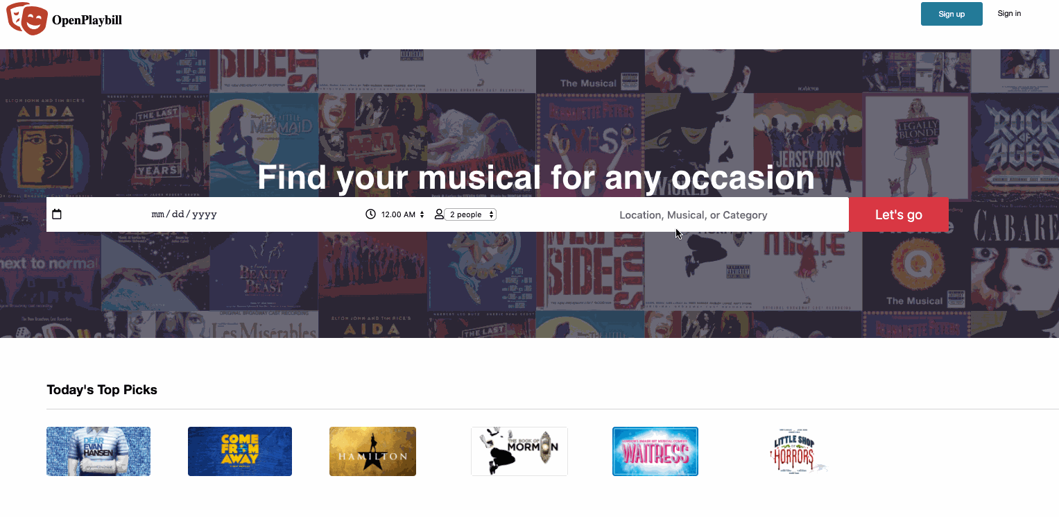 Pixel perfect clone of the dining and reservation website OpenTable with a broadway theme.